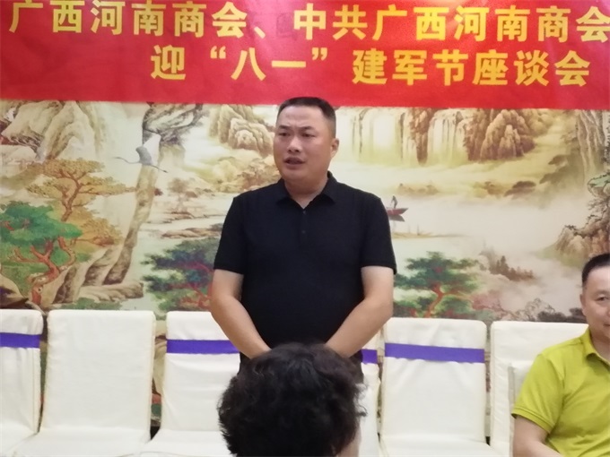 寧長凌說,在中國人民解放軍建軍九十一周年即將來臨之際,廣西河南商會在這里舉辦“八.一”建軍節座談會,邀請老鄉中的現役、退役軍人代表及部分河南籍老領導到會,其目的有兩個:一是軍人出身的老鄉們為保衛祖國做出了巨大貢獻,是河南人中的優秀代表,商人們學習的楷模,借此機會向諸位表示敬意!二是給軍人出身的老鄉們提供一個交流平臺,通過座談與交流進一步增強鄉情與友誼。