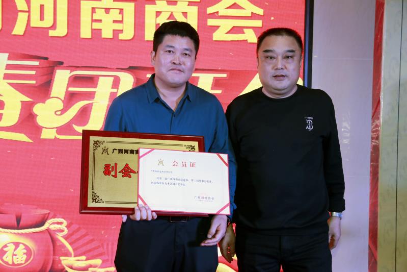 團(tuán)拜會(huì)的第一項(xiàng)內(nèi)容是為新會(huì)員單位頒發(fā)牌匾、證書。在熱烈的掌聲中,寧長(zhǎng)凌、劉泉峰、徐洪寬、張志勇、婁曉寬分別為副會(huì)長(zhǎng)單位:廣西世禧農(nóng)業(yè)科技有限公司和會(huì)員單位南寧市風(fēng)花樹文化傳媒有限責(zé)任公司;廣西安仕喜汽車銷售有限公司;廣西國(guó)鑫裝飾材料有限公司頒發(fā)了牌匾和證書。