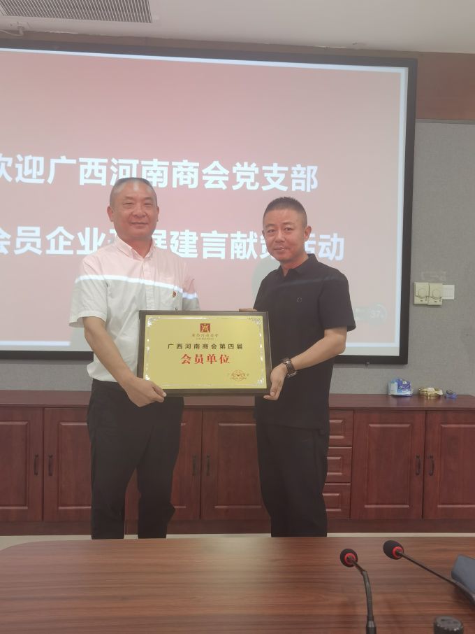 暢所欲言的座談,使黨支部書記杜華勇感到特別欣慰。他說,此次走訪交流活動的效果很好,大家給商會和黨支部所提的懇切建言與發展良策,很中肯且針對性強。今后,黨支部將根據各位的建議,結合商會和黨支部的實際情況,加強黨建工作與黨建引領,確保商會建設不偏航。杜華勇還說,以劉泉峰會長為代表的商會第四屆領導班子,對商會黨支部的各項工作都很重視,今年已舉辦黨建活動多次,開展走訪活動13次,這諸多活動,密切了黨支部與黨員和會員企業之間的聯系,提高了黨員的綜合素質,為商會收集了許多寶貴意見和建議,今后還將繼續開展此類活動。座談之前,杜華勇向新入會員單位——廣西凱歌智能科技有限公司董事長孫凱頒發會員牌匾。