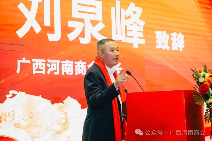 劉泉峰致辭時首先代表廣西河南商會全體會員,向到會的領導、嘉賓、鄉賢同仁和長期以來關心、支持、幫助商會發展的老領導,社會各界人士表示熱烈的歡迎和衷心的感謝!