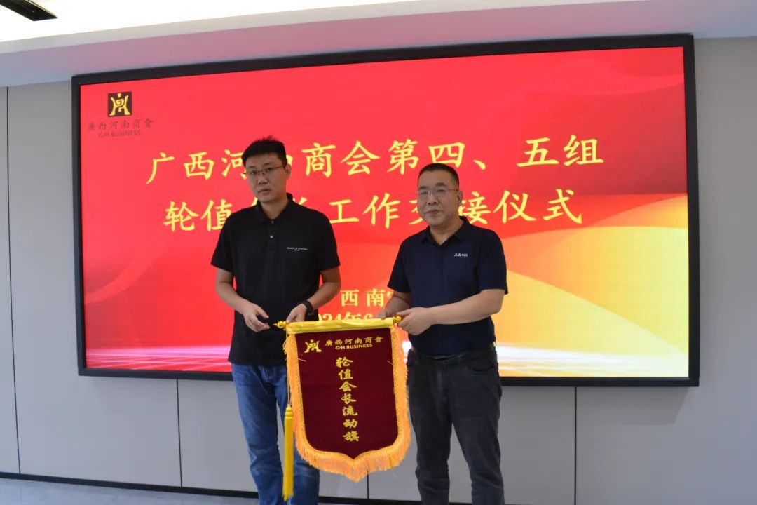 第四組輪值組長婁曉寬與第五組輪值組長張強(qiáng)進(jìn)行了輪值旗幟的交接儀式。