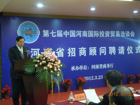 2012年3月23日下午第七屆中國河南國際投資貿易洽談會、河南省招商顧問聘請儀式在鄭州國際會展中心舉行。大會由河南省政府副秘書長劉世偉主持,副省長趙建才致辭,省商務廳廳長李清樹宣讀聘請河南省招商顧問的決定。我商會劉匯豐會長被聘為招商顧問,趙建才副省長、李清樹廳長為各招商顧問頒發聘書。