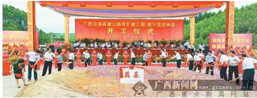 6月27日上午,自治區主席馬飚、自治區政協主席陳際瓦等領導為廣西沿海高速公路改擴建工程(南寧至欽州段)開工奠基。記者 何運斌 攝