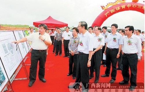 6月27日上午,自治區隆重舉行重大項目開工儀式。圖為自治區主席馬飚、自治區政協主席陳際瓦等領導在廣西體育中心三期項目開工儀式上聽取項目負責人現場匯報。記者 何運斌 攝