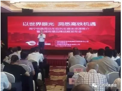 本會訊 5月19日15時,由廣西河南商會、廣西鐵路旅游傳媒集團、廣西高鐵商旅有限責任公司聯合舉辦的,《以世界眼光洞悉高鐵機遇——南寧鐵路局動車/高鐵列車媒體資源推介暨全域傳播品牌戰略發布會》在南寧市雙擁路南湖名都國際大酒店49樓凌云廳隆重舉行。來自南寧鐵路局、本會會員單位、各商協會、金融行業、新聞媒體等單位和企業代表及部份河南老鄉共400余人到會。