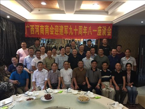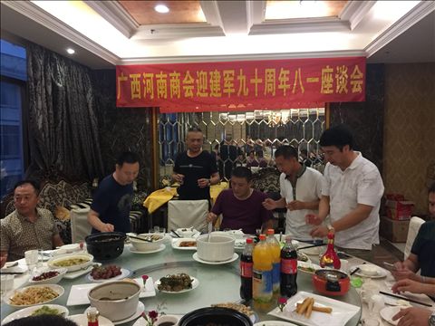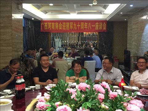 本會訊 2017年7月23日18時,廣西河南商會在南寧市桃源路43號五千年大酒樓舉行“迎建軍九十周年‘八·一’座談會”。本會執行會長劉泉峰,監事長徐洪寬,常務副會長杜華勇、張志勇等商會同仁到會,本會的全體復退軍人、廣西河南同鄉聯誼會的部份復退軍人受邀參加座談。